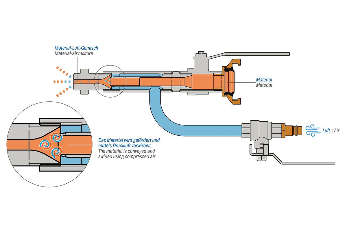 Der Vario-Spritzdüsenkopf zerstäubt das Material mit Hilfe von Druckluft. Durch Drehen der Düse kann das Spritzbild dem verwendeten Material angepasst werden. Dadurch wird verhindert, dass ein Unterdruck entsteht und der Materialschlauch leergezogen wird. Somit ist ein sauberes Spritzbild ohne Lufteinschlüsse in Schichtstärken bis zu 3 mm nass zu erzielen. Standardmäßig wird eine 6 mm Düse verwendet.