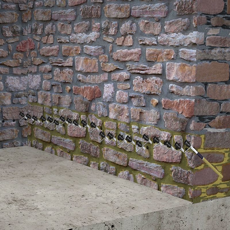 L'injection supplémentaire (injection sous pression) est un système d'étanchéité contre l'humidité capillaire montante. De plus en plus on transforme les caves en pièces d'habitation. Très souvent, il faut étancher les murs humides professionnellement pour répondre aux exigences de qualité. En cas des cavités, on y injecte de la pâte de ciment. Le but est l'étanchéité horizontale par l'injection de la maçonnerie contre l'humidité capillaire montante. Il faut interrompre les capillaires dans le matériau de construction et réduire le pourcentage d'humidité dans les murs. Le remplissage des vides et l'étanchéification horizontale sont réalisés avec le même système d'injecteurs.Avantages