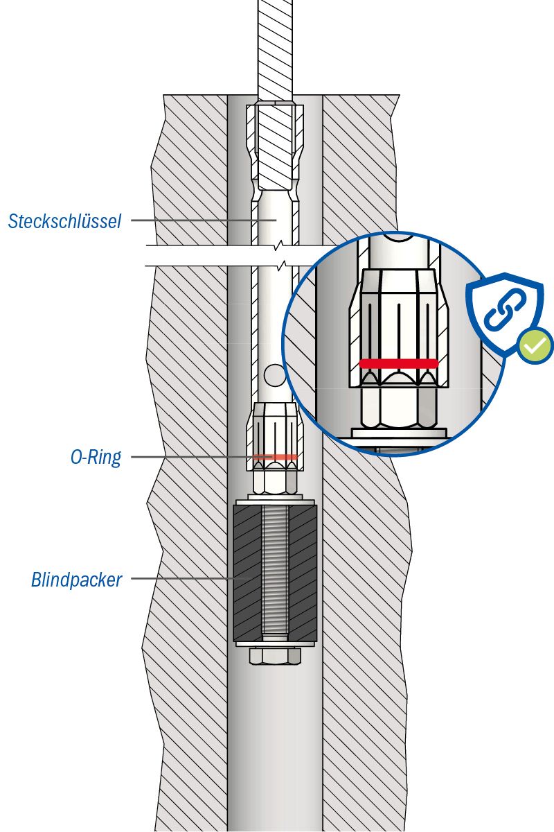 - Das Verspannen der Blindpacker in den Öffnungen erfolgt mit einem Steckschlüssel über die Anzugsmutter